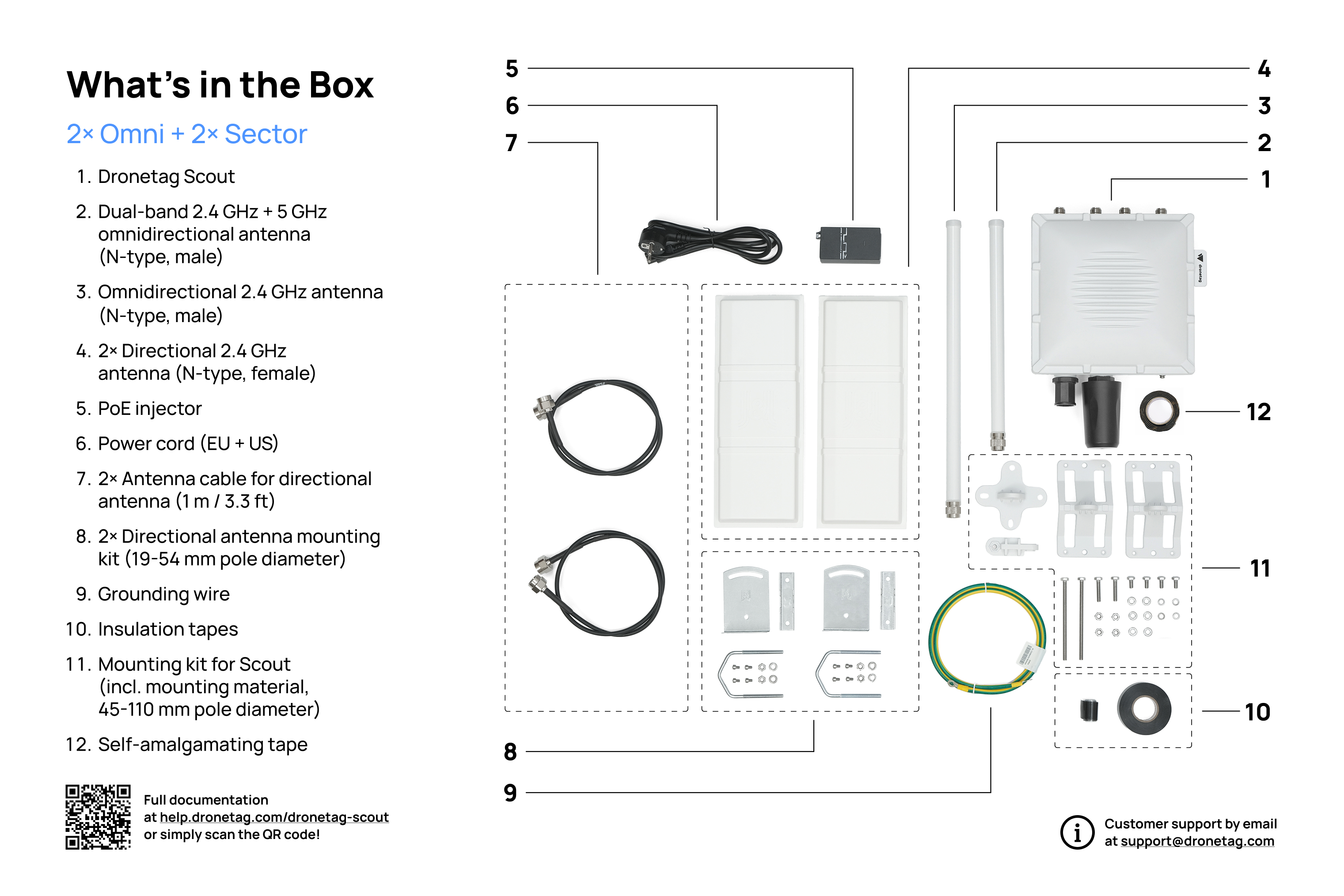 This image illustrates the standard contents included in the package of Scout with directional antennas.