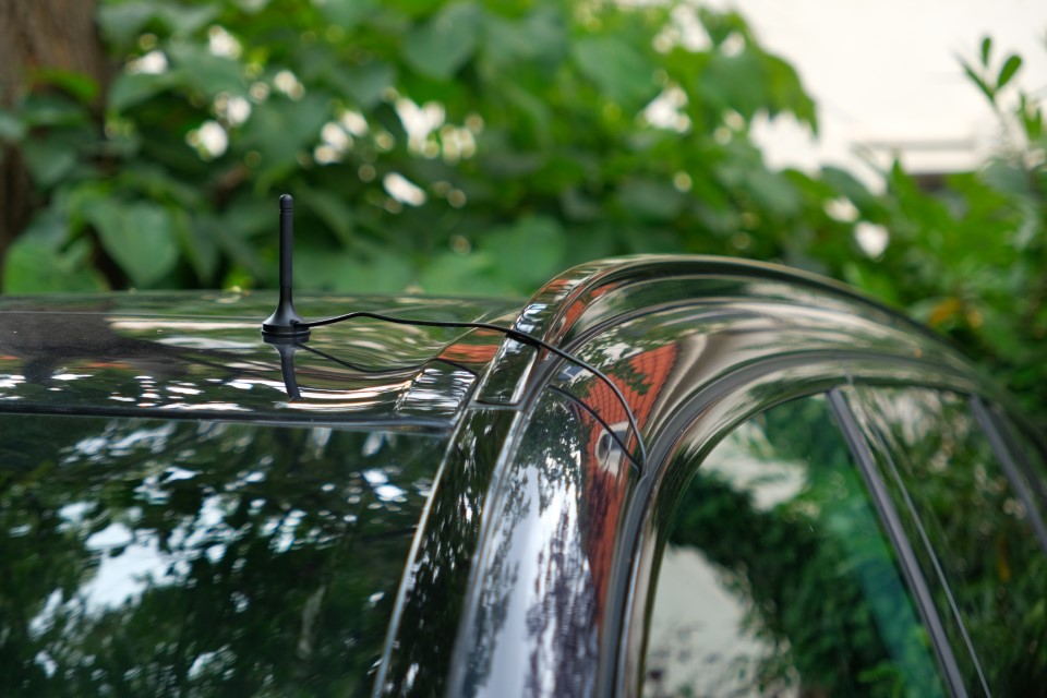 - Clean the roof area; place the magnetic antenna on the metal surface.